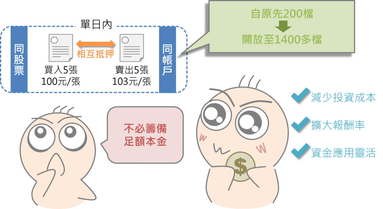 而2016年擴大放寬當日現股當沖交易標的範圍,從原先的200檔擴大到1400多檔,也大幅降低投資人操作的資金門檻、提升投資報酬率。
