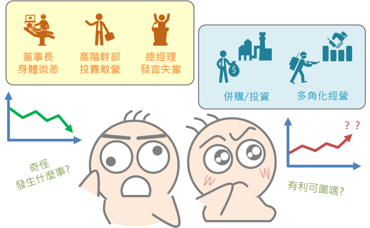 企業董座身體微恙、高階幹部投效競爭對手或總經理在媒體上失言,對企業股價是否有影響?諸如此類的產業界新聞,雖然可能只是「個人」的行為,但就歷史數據來看,確實都有著一定的影響力,更不用說是鴻海投資夏普,或謠傳富士康與台積電將聯手競標東芝半導體,這類牽扯整體企業策略的事件了。