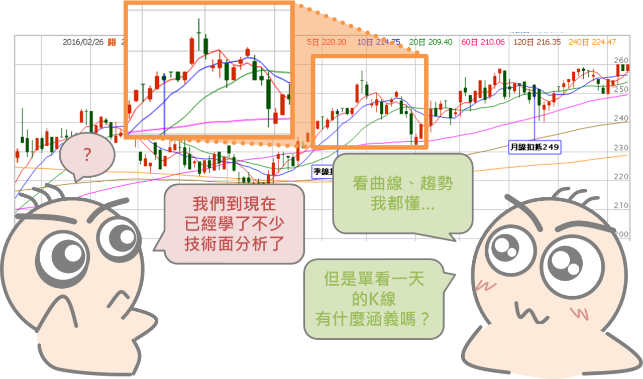 K線(Candle stick chart)是觀察股價走勢最基礎的工具,對於偏好技術面分析的投資人而言更是不可或缺的資訊,舉凡月線、季線、均線扣抵、各式型態等,都必須從中取得線索。其中每天有紅有綠、有長有短、有粗有細的線條,都是以最簡單的圖形來呈現當日多空交戰的情況,尤其是在每一次趨勢轉折之處,也會忠實地顯現出來,本篇就針對這基礎中的基礎,為新手投資人進行完善的介紹。
