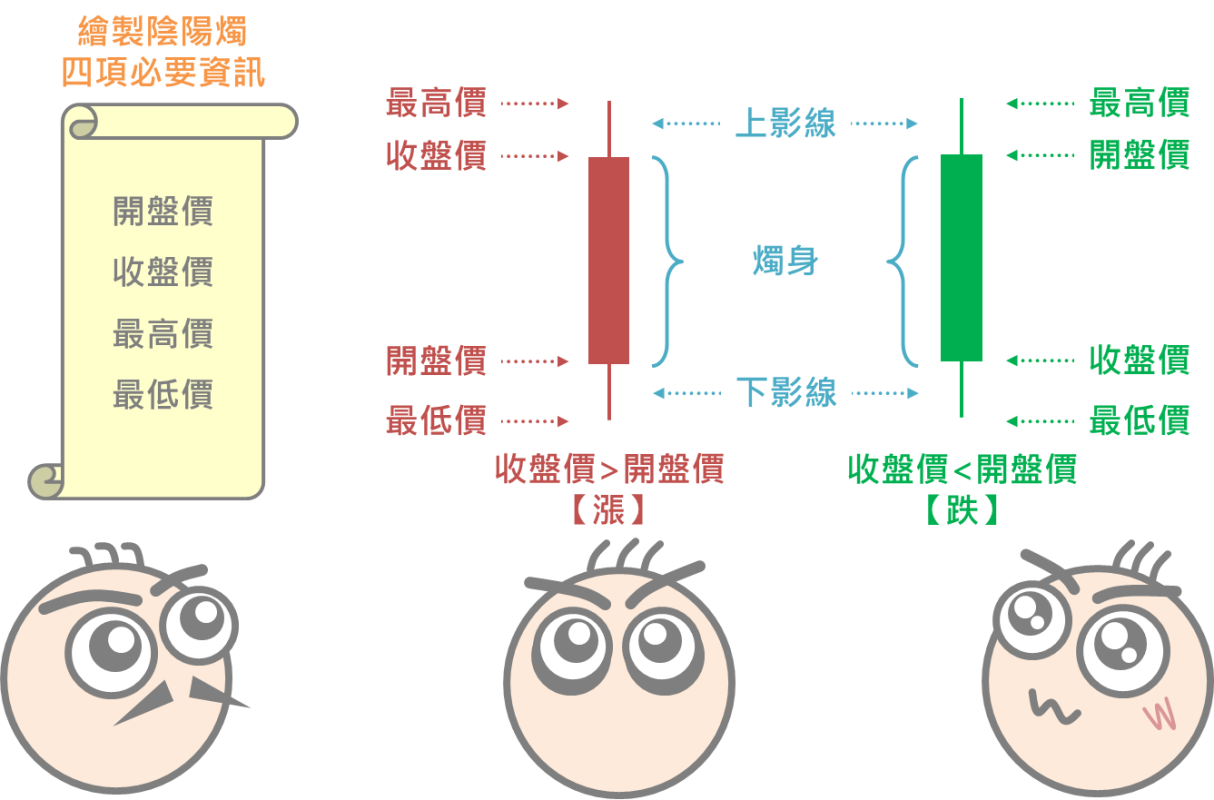 其中開盤價與收盤價之間的範圍,稱為燭身,最高價與最低價之間則成為影線,至於陰陽燭的顏色則是由當日股價漲跌而定,如果當日開盤價低於收盤價(當日股價上漲),則陰陽燭為紅色或無色,相反的,如果當日開盤價高於收盤價(當日股價下跌),則陰陽燭為綠色或黑色。