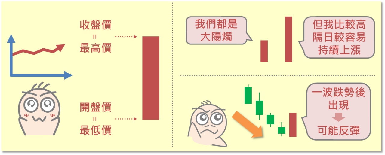 為陰陽燭中最淺顯易懂的兩種圖形,其中大陽燭是指開盤價即為當日最低價,收盤價則為最高價,顯示出當日一路上漲的情勢,一般而言常出現在漲勢過程中,且隨著上漲的幅度越大,隔日持續上漲的機率越大,也就是說這個時候多方的力道相對比較強,而且還沒有受到明顯的空方壓力,隔日上漲的機率自然也就越大。如果大陽燭出現在一波跌勢之後,則有可能代表著這波跌勢的反轉訊號,至於大陰燭的情況則恰巧相反,在此就不再贅述。