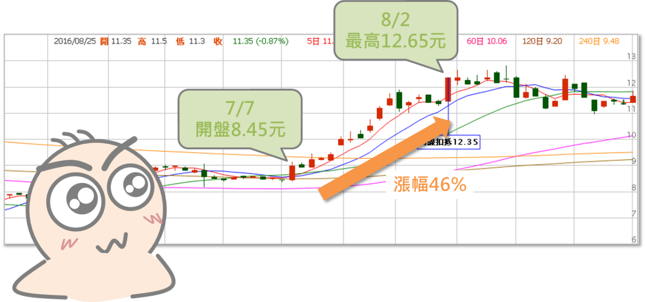 以金像電(2368)為例,7月7日至8月2日,不斷形成若干大陽燭,隔日股價亦能持續上漲,在短短不到一個月的時間裡,股價就上漲了約46%(8.45元至12.35元)。
