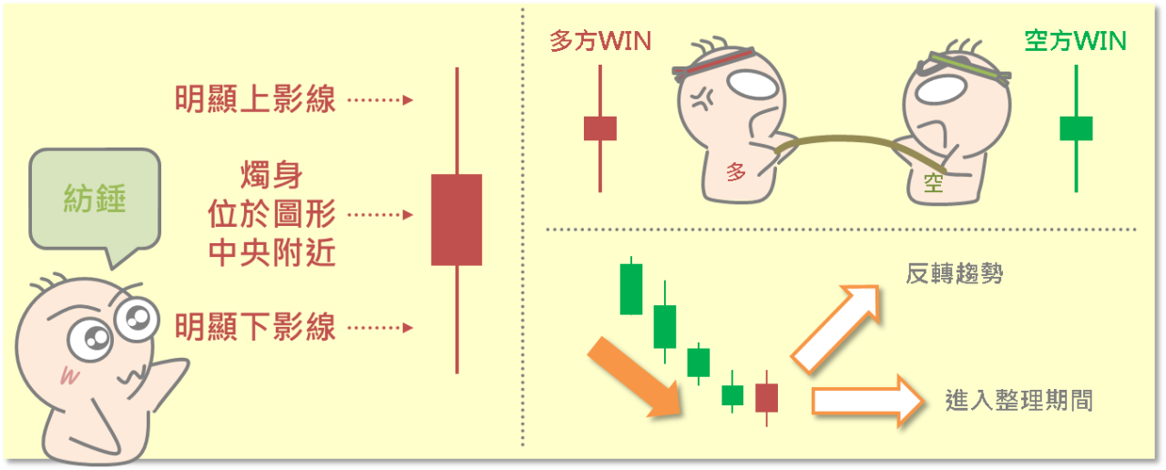 當兩端影線超出燭身許多,而燭身恰巧又位於影線中間位置,部分投資人稱它為「紡錘形」,出現此一圖形表示當日多空交戰相當激烈,若最終形成陽燭,表示多方略勝一籌,反之則為空方佔上風。紡錘形的陰陽燭通常出現在明顯漲跌勢之後,表示趨勢不再像過去那麼一面倒,多空雙方皆受到不小壓力,後續可能即將反轉或進入一段整理期間。