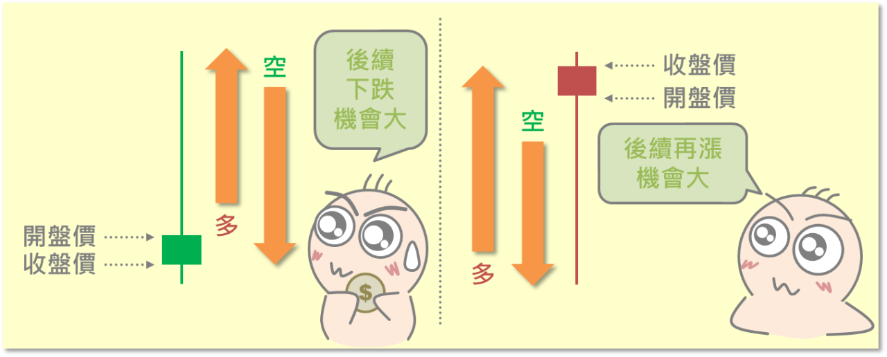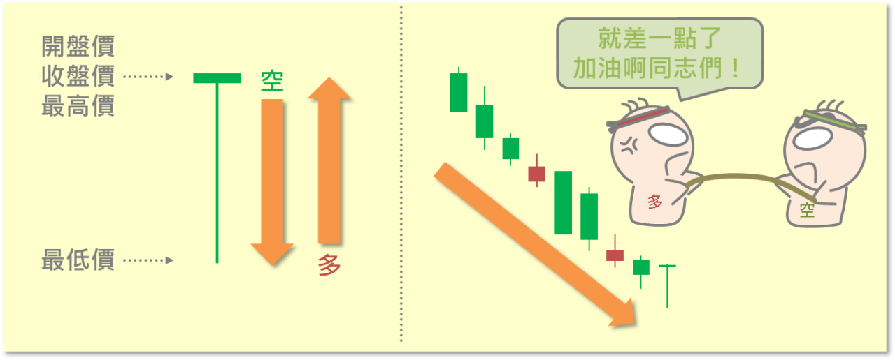 相反的,短上影線與長下影線則表示空方不斷壓倒多方,使得最低價不斷下探,但在低位時又有多方不斷承接、支撐,於收盤時將價格拉回開盤價附近,如果最後呈現陽燭,則投資人後續可預期上漲行情。