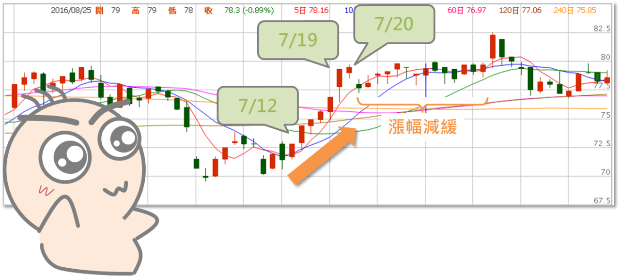 以群光(2385)為例,於7月12日起多方不斷發動攻勢,至7月19日之間皆形成短上影線、長下影線的陽燭,價格不斷向上攀升,只是隨著下影線越來越長,顯示在過程中受到賣壓越來越強,終於7月20日轉為紡錘型,漲勢稍停。