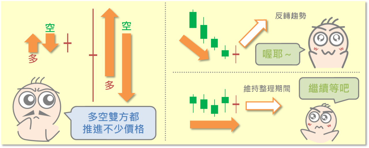 由此可知,當在漲跌趨勢中發現形成十字線時,由於趨勢可能自此開始反轉,因此持股投資人必須特別謹慎。