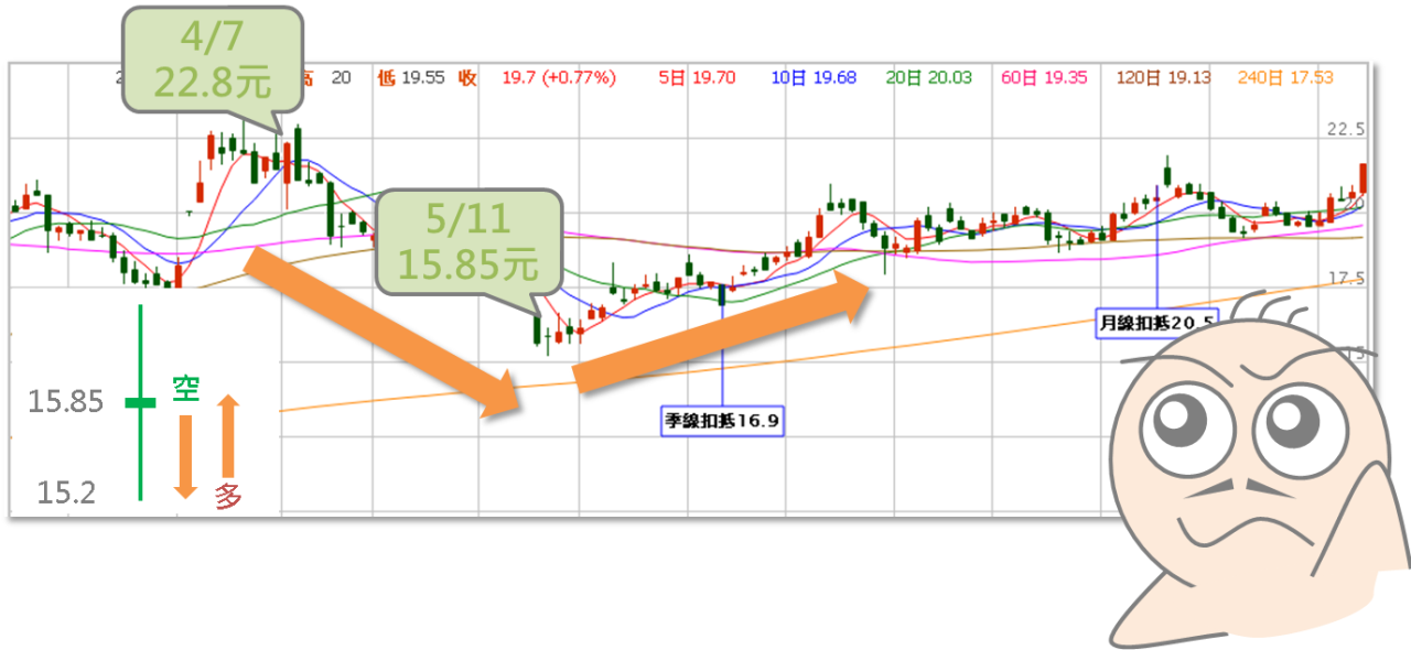 以凌巨(8105)為例,自4月7日起股價即從22.8元不斷下跌,途中於歷經幾次大陰燭,一直至5月11日開盤15.85元,雖然於盤中最低價曾下探至15.2元,但多方承接的力道越來越強,使得最終得以15.85元作收,形成十字線,隔日多方順勢帶動股價上漲,順利反轉原先下跌的趨勢。
