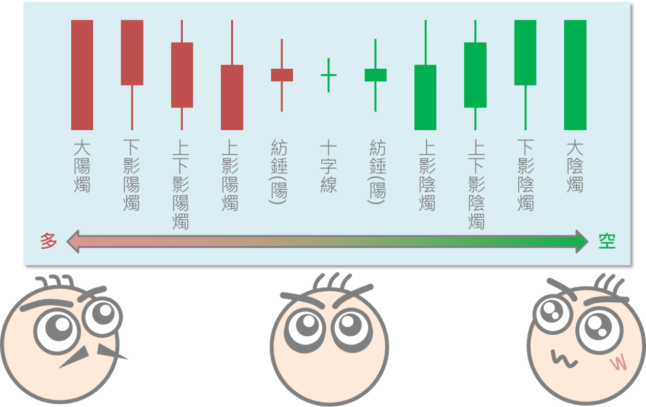 綜合上述所說,為了讓各位更容易記憶各式圖形的多空趨勢,在這邊將各種常見的陰陽燭排列如下,以利各位快速辨別當日多空交戰的氛圍囉!