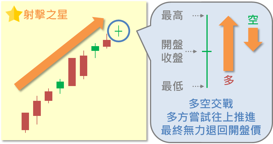 在眾多的陰陽燭圖形當中,由於十字線經常代表著趨勢反轉的訊號,因此最受投資人關切,其中又以「射擊之星」最為重要,所謂的射擊之星是指在漲勢後出現的十字線,顯示當日開盤時最高價不斷向上提高,但這樣的態勢並未能維持到收盤,反而在收盤時退回到開盤水準,表示此波漲幅已經觸頂,即將反轉。