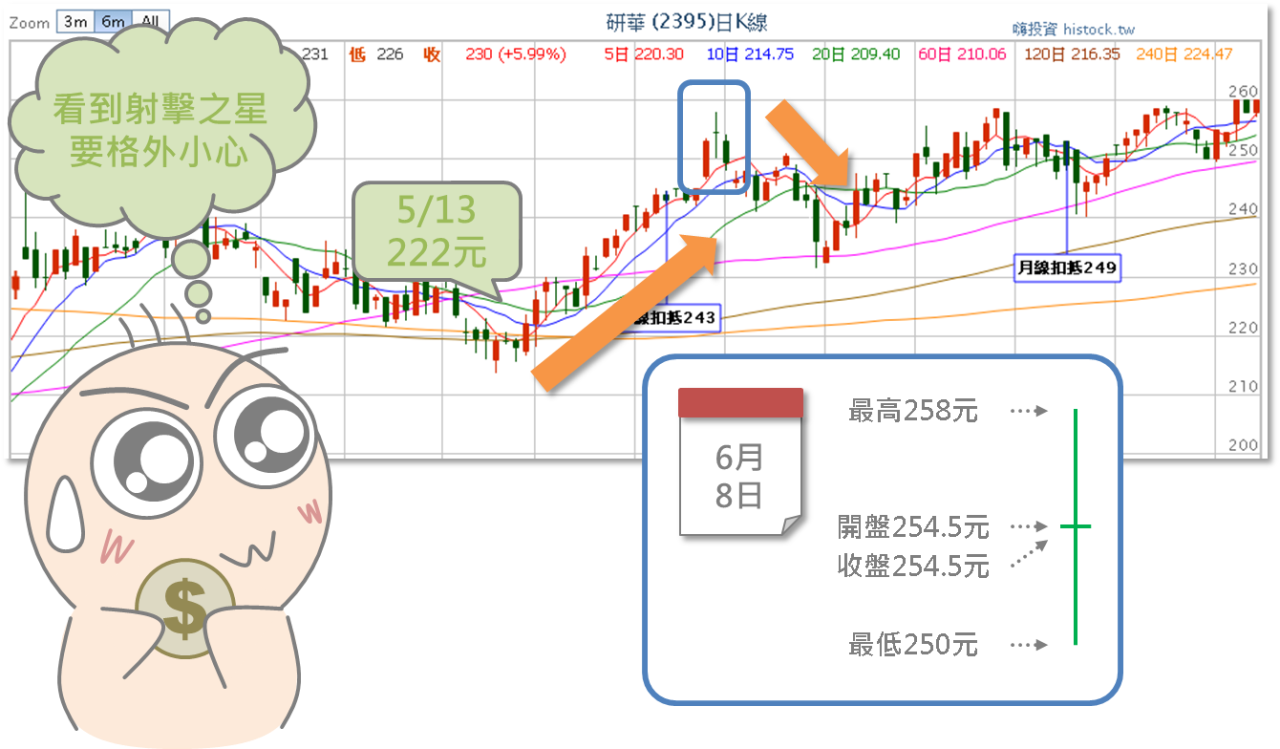 以研華(2395)為例,股價自5月13日的222元開始上漲,途中形成若干大陽燭及短上影、長下影之陽燭,顯示多方在此過程中壓倒性蓋過空方,6月7日單日更上漲6元之多,惟到了6月8日,開盤價254.5元,盤中最高價與最低價分別來到258元和250元,最終以254.5元收盤形成射擊之星,顯示出多方承受相當大的賣壓,已無足夠能量繼續往上突破,此時投資人急欲出場,以避免後續下跌侵蝕已獲得的利潤,進而使得隔日趨勢快速反轉下跌。
