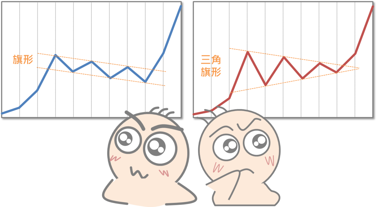 有時候在市場中可以看到某些股票經過一段時間飆漲之後,會暫時性的進入整理期間,且在這段時間內股價稍稍往下修正,爾後又瞬間向上飆漲,將整理期間的各個股價高點相連、各個股價低點相連而形成兩條線,若這兩條線呈平行分佈,就屬於旗形型態,如果兩條線逐漸合攏,則像是一面三角旗。