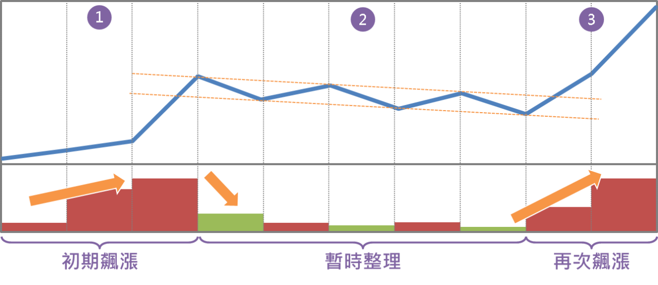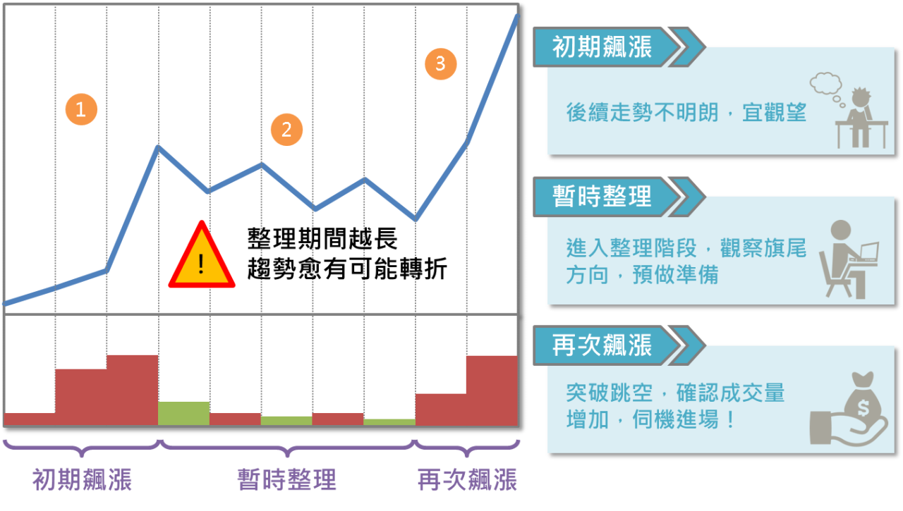 不論是旗形或三角旗形,發生的時間點都是股價飆漲趨勢中一個短暫的整理期間,大致上可以區分為三個階段: