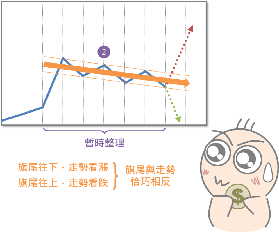 不過可能會有投資人認為,小編能夠歸納出這樣的走勢與特徵,也是站在事後諸葛的角度來看,如果投資人正處於第二階段時,該如何判斷後續真的會持續飆漲?而不是準備反轉重挫?經過許多投資前輩觀察,旗尾的方向會暗示後續的走勢,旗尾向下,後續股價會持續飆漲,旗尾向上,則會往下探底,意即旗尾的方向會與後續股價走勢恰巧相反,不管是旗形或三角旗形,皆是如此。