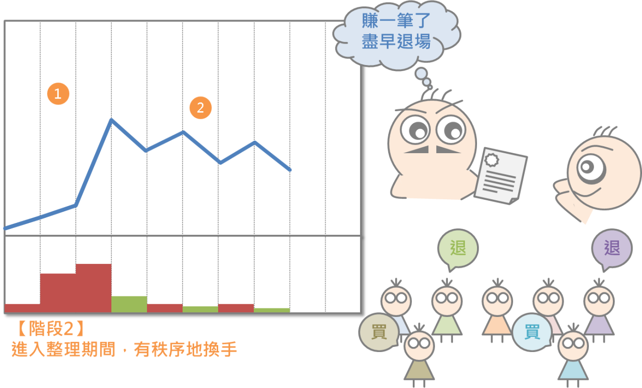 假設某A股因為釋出某種利多的消息,而吸引一群投資人紛紛搶進、哄抬股價,成交量也順勢放大,也就形成了階段1:第一次飆漲。