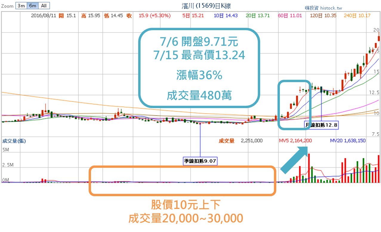 濱川(1569)在2016年上半年一直沒有特別的動靜,價格始終維持在10元左右打轉,成交量亦只有幾萬張。但到了7月起開始向上飆漲,自7月6日開盤價9.71元,一路漲至7月15日的最高價13.24元,其中更歷經兩次跳空,短短不到十天漲幅就達到約36%,成交量也達到單日480萬張,幾乎是之前的20多倍。