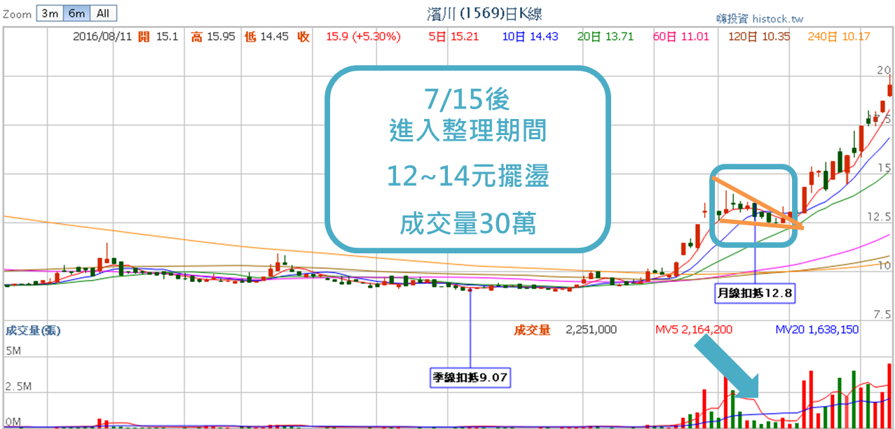 7月15日後開始進入整理期間,陸陸續續漲跌兩三次,讓已經獲利而且亟欲退場的持股人,將手中的股票換手至看好後續會持續飆漲的投資人,這段期間股價一直在12至14元上下擺盪,逐漸形成三角旗的旗面,成交量也明顯萎縮至30萬張左右。