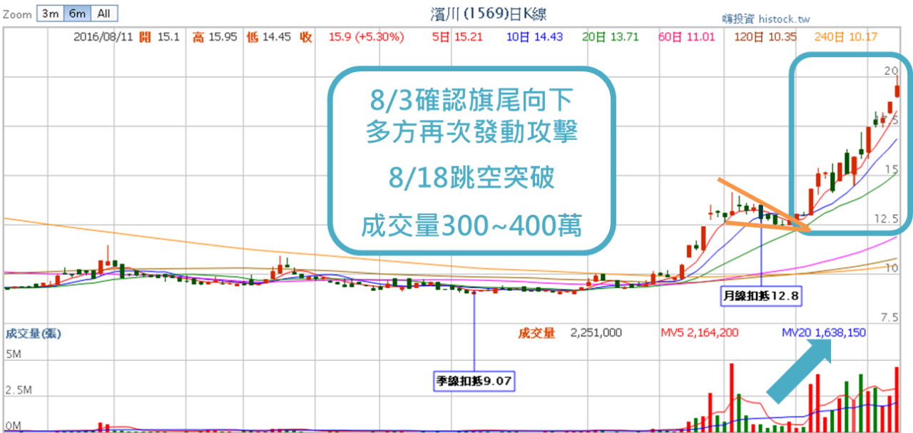經過約兩周的整理期間,已可觀察到旗尾向下的傾向,重新於8月3日發動第二波攻勢,於8月18日再次跳空突破,成交量也回到3、400百萬張的規模,順利完成旗形走勢。