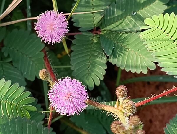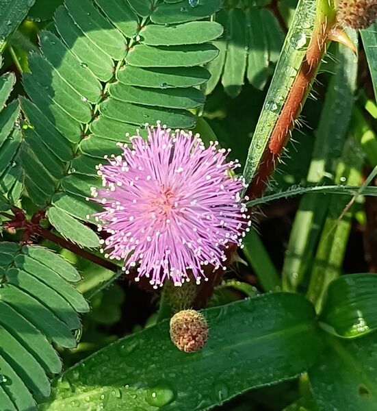 含羞草給小孩帶來最大的驚喜,就是碰觸它的葉子,葉子會立刻垂下收攏,讓充滿好奇的小孩子不一樣的感受。我小時候就很喜歡這樣的觀察,輕輕碰觸,迅速合攏。因此含羞草有個別名叫見笑草、愛睏草(台語)。
