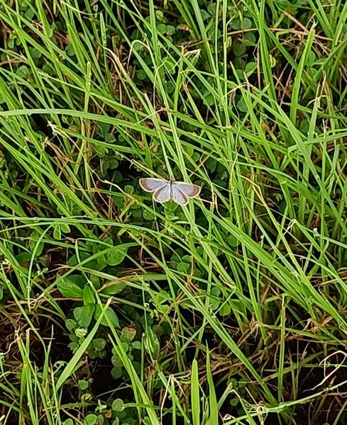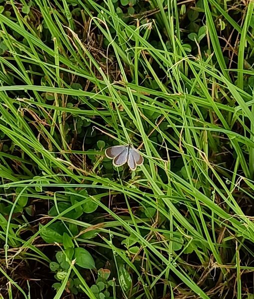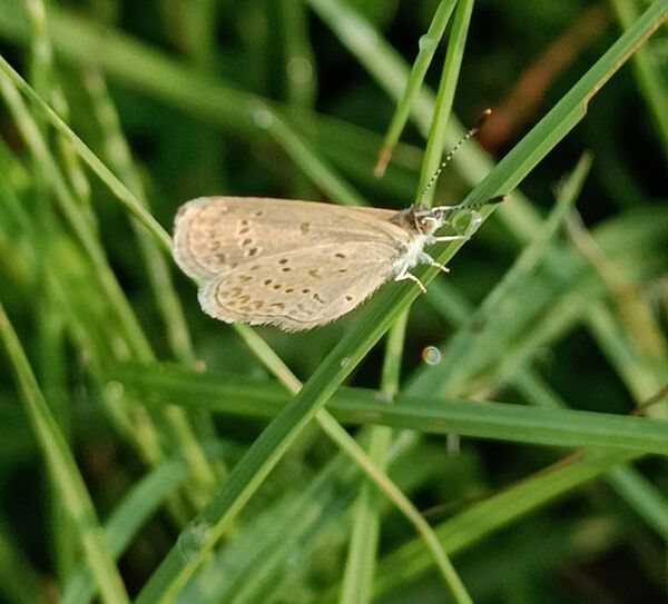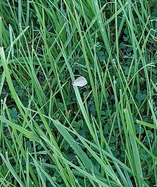 清晨六點半,走在有太陽光的操場周邊的跑道,操場裡的青草綴著晶瑩的露珠。一株青草頂端似乎黏著一小葉片,靠近一看,竟然是一隻迷你小灰蝶。再往旁邊看,發現有不少株草的頂端,都停著一隻迷你小灰蝶。