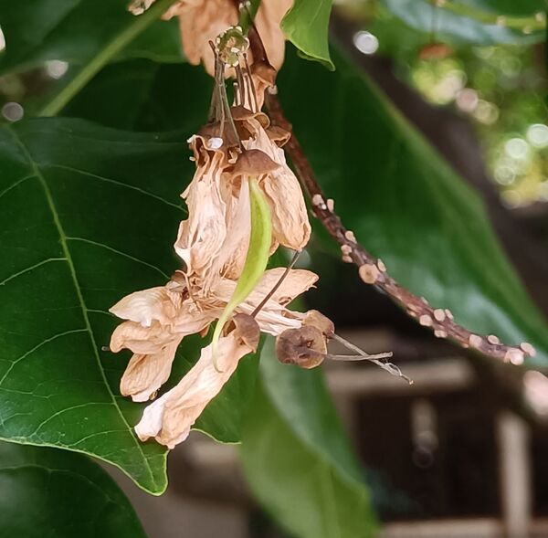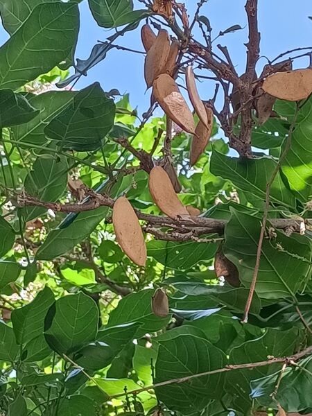莢果木質,長橢圓形,略呈刀狀,扁平。種子扁球形,黑色,富含油脂,種子提煉之油脂可治皮膚病。。