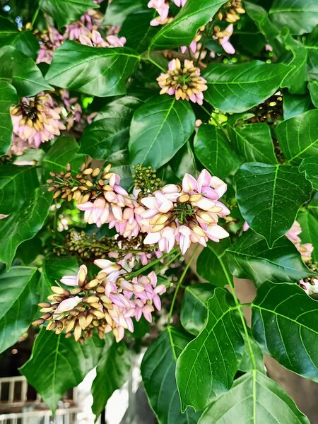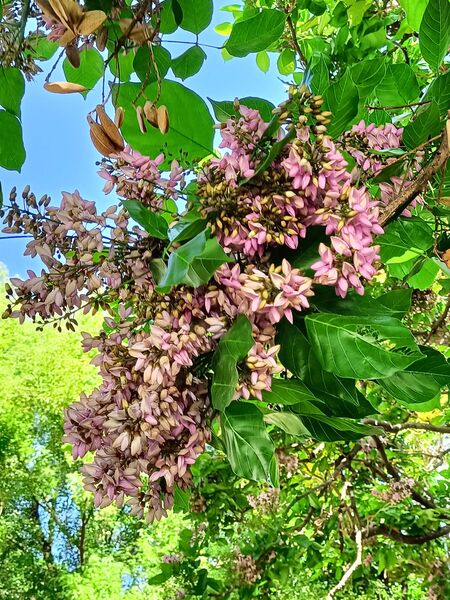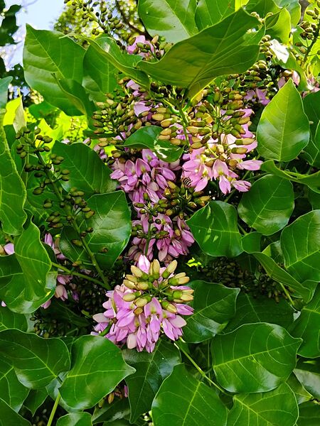 水黃皮正盛開著花,葉片油油亮亮的,如果手機有下載植物辨認軟體(例如形色),應該可以讓它辨認看看,您看到的是不是水黃皮