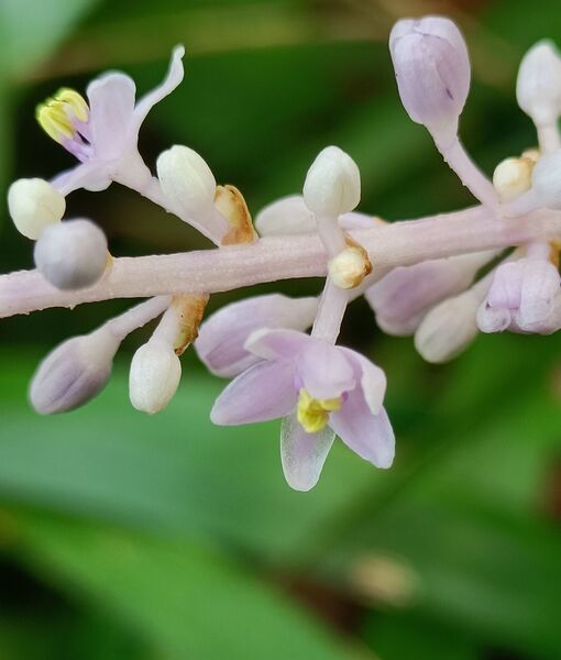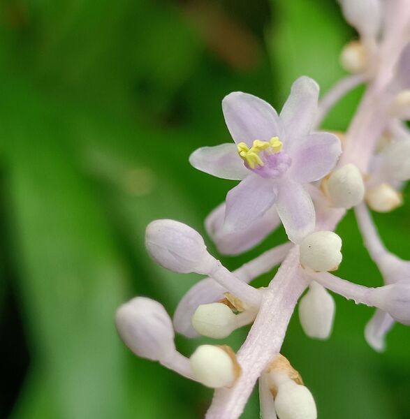 花期夏至秋季,花莖長約 8~18 公分,每一花莖上著生約 30~60 朵花,排列成疏總狀花序,花被淡紫色或近於白色,雄蕊 6 枚。
