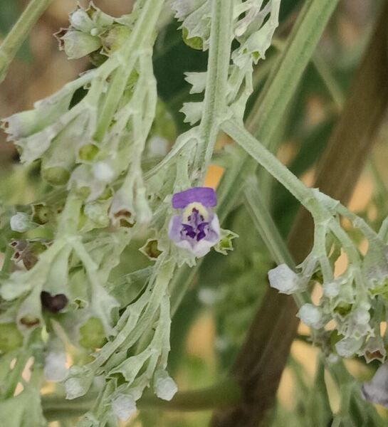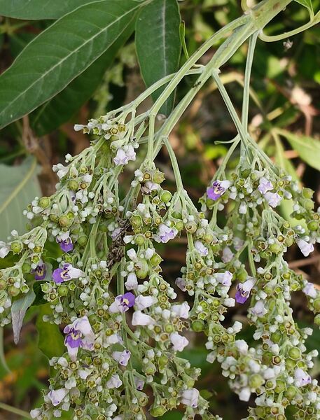 花小,圓錐狀聚繖花序;萼鐘形;花冠淡紫色,漏斗狀;雄蕊 4 。核果。全株有特異香味