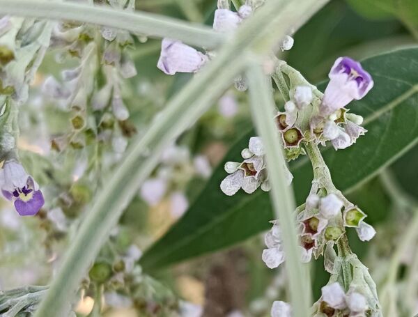 這幾天回南部鄉下探視雙親,得空出去田野間散步。農人總會在田邊種一些果樹或防風的植物,散步時就有可能會有一些驚喜,這次發現了滿滿花苞,開著淡紫色小花,陌生的植物。以植物辨認軟體“形色”比對,答案是“黃荊”,上網查黃荊的檔案,應該是黃荊沒有錯。