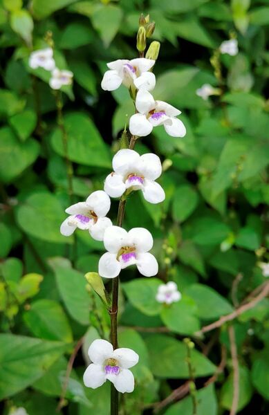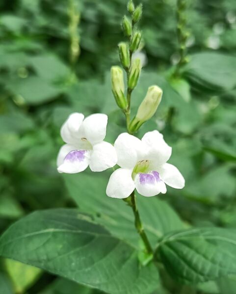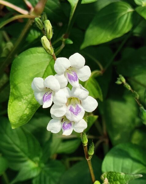 總狀花序頂生。花萼5裂;花冠白色,5枚;下唇基瓣具紫斑;雄蕊4,2強;蒴果長橢圓形。花期秋冬之間。