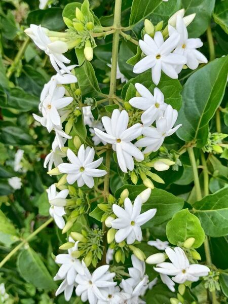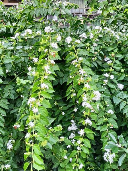 那天經過一所學校圍牆,看到一叢藤蔓類植物,滿滿開著花。經以植物辨認軟體“形色”比對,說是“毛茉莉”。