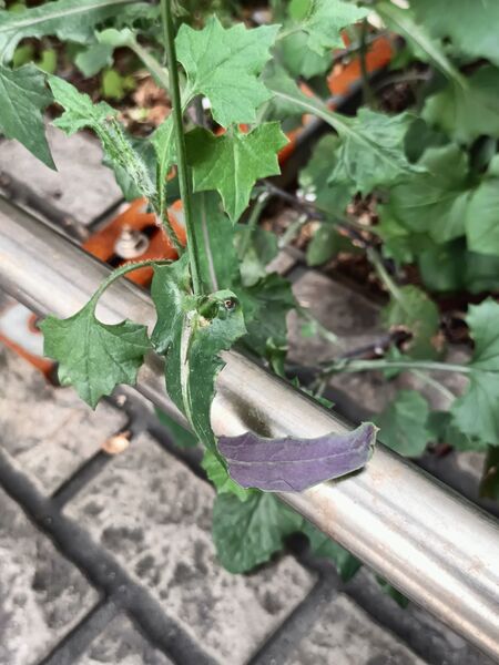 葉: 單葉,互生;下部葉具柄,上部葉無柄;下部葉片卵形至披針形,葉尖銳形,葉基箭形,葉緣粗鋸齒緣;上部葉線形,較小;葉基抱莖,羽狀分裂,葉柄有翼。