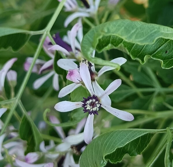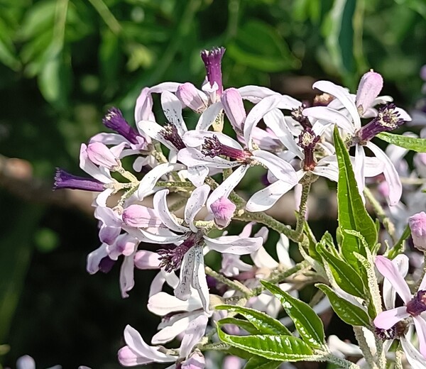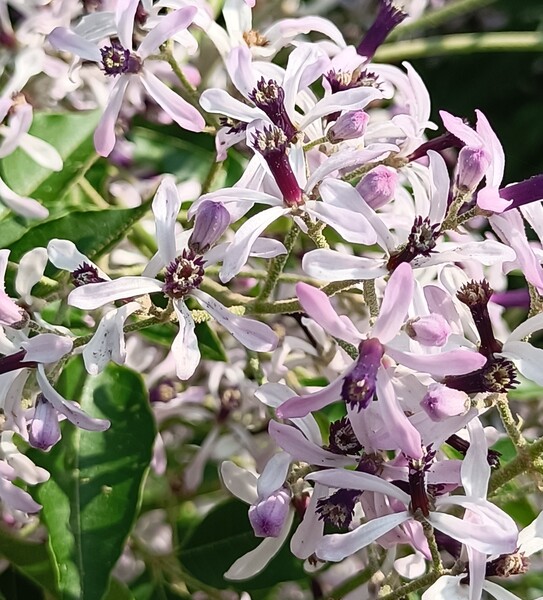 苦楝(苦苓)大都是高大的喬木,開花時樹冠映入眼簾的淡紫,在那片空中吸引注目。不過,大概很少有機會近距離欣賞苦楝花朵的美,它一朵一朵的小花究竟是長什麼樣子呢?它的花瓣是淡紫色,在陽光下趨近白色,為什麼遠看可以感應到淡淡紫色呢?