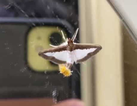 這應該是一隻蛾,究竟是什麼哦?上google圖片比對,由於特徵明顯,一下就知道它是瓜絹野螟蛾。至於其尾部晃動的黃色絨毛球是什麼呢?繼續在網路搜尋瓜絹野螟蛾資料,在“這是小明的部落格” https://share.google/F4CJJ8CFKcE53HSuT 2013年10月14日“瓜絹野螟雄蛾 ”文中提到,那是可釋放性費洛蒙的毛筆器。