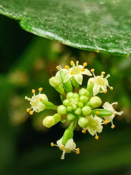 小繖形花序,腋生,呈兩至三層輪生於總花梗上,花瓣白色, 5 枚。