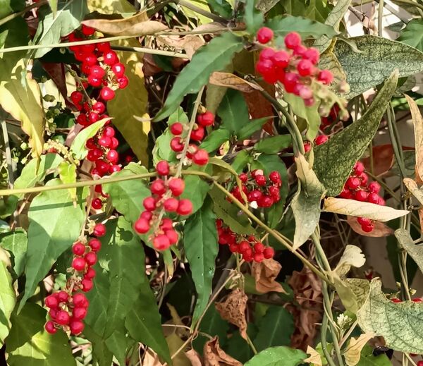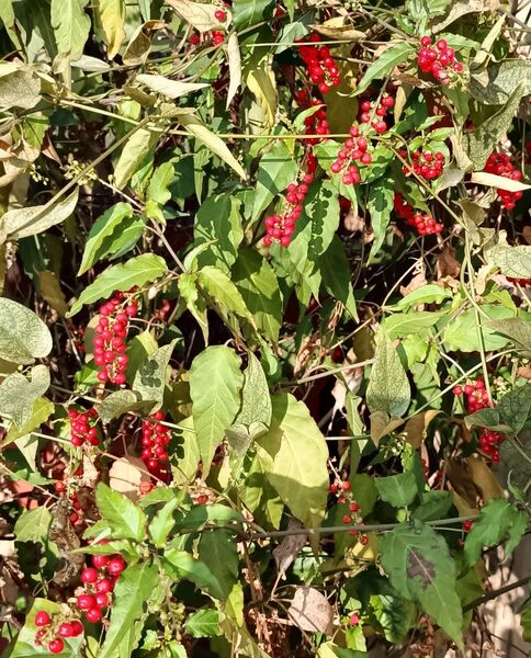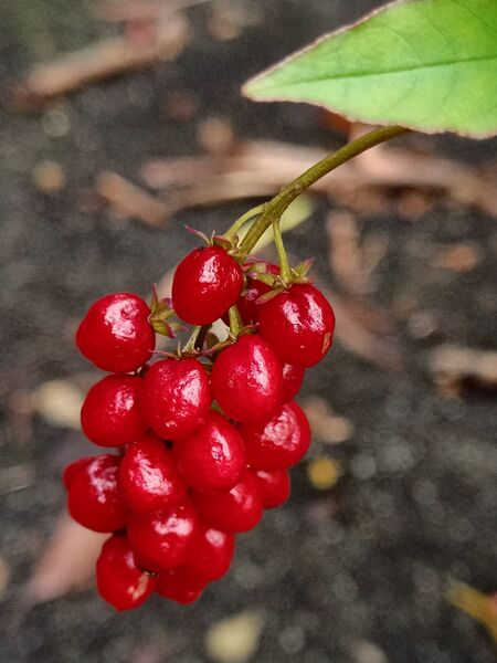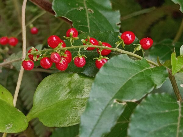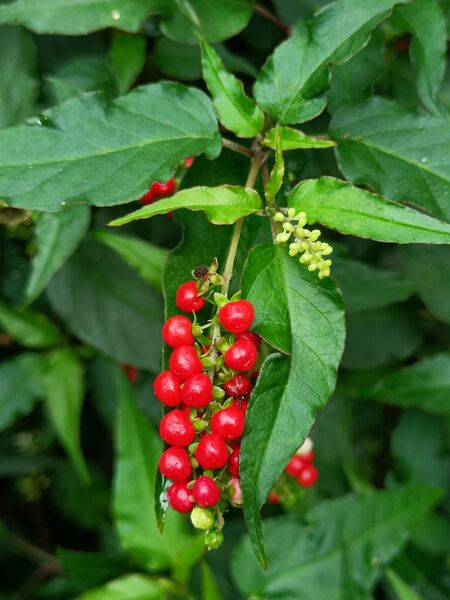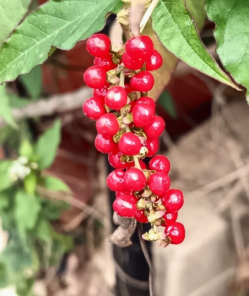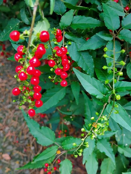 學名Rivina humilis的珊瑚珠,別名珍珠一串紅,商陸科,多年生半落葉亞灌木。它原產於西印度、熱帶美洲,株高四十至八十公分,生性強健,容易繁殖,以觀果為主,非常適於庭園美化或盆栽。