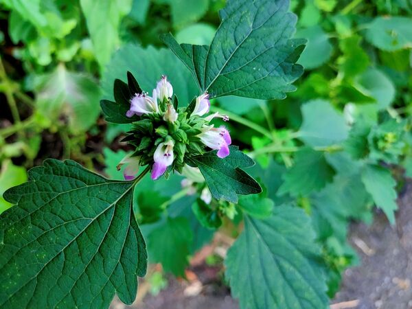 單葉對生,葉片草質,寬卵圓形,長4-9公分,葉邊有不規則牙齒,表面深綠色,背面灰綠色,葉柄長1-4公分;苞葉葉狀,都超出輪傘花序。