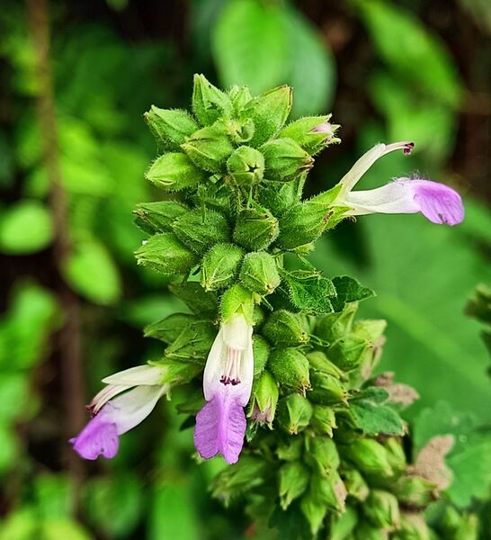 輪傘花序在主莖和側枝是排列成長穗狀花序,花萼鍾狀,有5齒,結果期增大,花冠淺紫色,冠檐二唇形,上唇直伸,下唇水平擴展,雄蕊4個,8-9月開花;