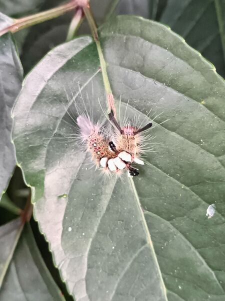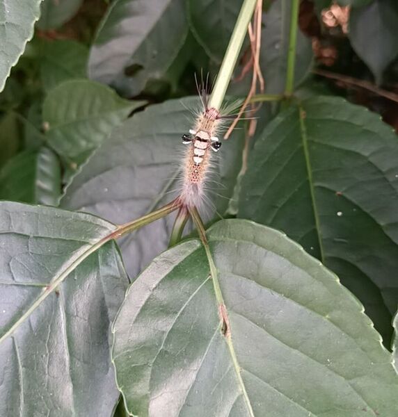 那天散步時看到綠色的茄苳葉片上有隻毛毛蟲,頭頂上有著兩條黑色長長的觸角,淡土黃色的身體上有四個明亮的白色毛塊,白色毛塊兩側及底部又各有著黑色塊,全身都是白色的長毛,非常可愛且似曾相識。牠靜靜地附在葉片上,我從不同角度拍牠,不知道是不是不小心碰到葉片嚇到了牠,只見牠驀地轉身換了個方向開始移動了,急忙切換手機錄影模式,追隨著牠的腳步。當牠爬到葉基被較大的樹枝擋住,牠又停了下來,也許在思考再來該怎麼辦。我想想覺得自己也不該再打擾牠,就此結束了這段偶遇。