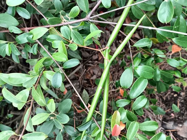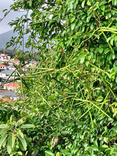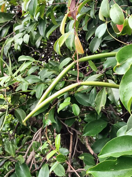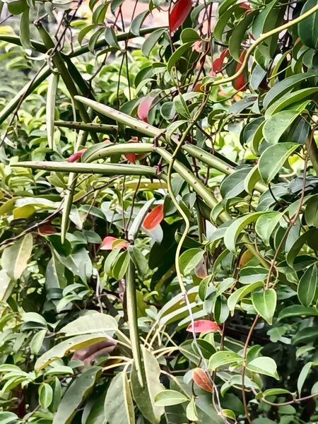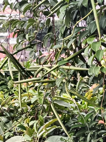 直到去年(2025年)7月中旬,一樣是看到它開著花,也跟前年一樣只要經過就瞄過,本沒抱任何期望,沒想到,突然看到從酸藤的枝條上原本開花的地方長出了長條的“果實”?經查酸藤果實是蓇葖果,就是長這個樣子,真沒想到竟然看到酸藤的果實了。去年酸藤的花一直延續開到8月,而每次經過也慢慢地看到果實變長變粗。