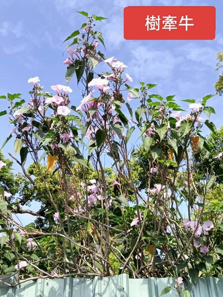百思不得其名稱之下,動念以“有粉紅色的牽牛花嗎”為關鍵字上網查詢,AI回答說有的,像變色牽牛、野牽牛、矮牽牛及樹牽牛等等,但可惜沒有圖片可以比對確認。於是動念改成搜尋圖片,沒想到圖片的第一張就出現與所見的花朵完全相同的植株,圖片下寫著“樹牽牛”,終於知道它是誰了。