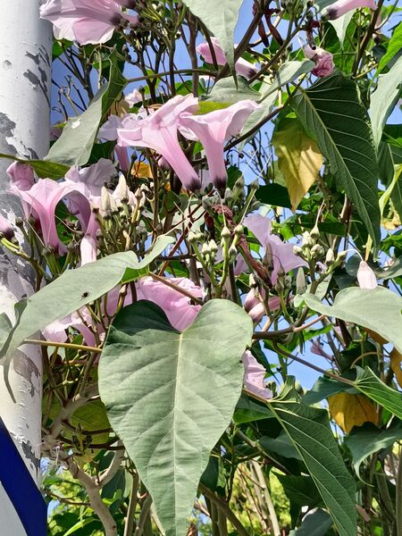 樹牽牛又叫南美旋花,是旋花科、番薯屬披散灌木,高1-3米;小枝粗壯,圓柱形或有棱,實心或中空,有白色乳汁。