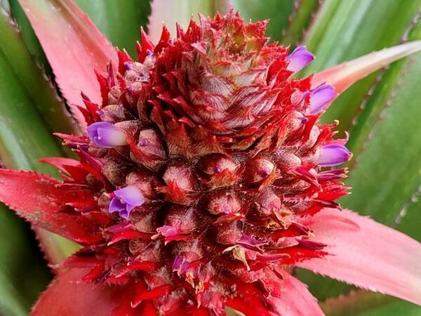 鳳梨---先結果後開花嗎? 鳳梨是很常見的水果,本以為沒有什麼值得談的。但因在郊山野外偶會看到結有“鳯梨果實”的植株,引起了我的注意;更因近日不經意地瞥見野外鳳梨果實上竟然開了紫色的花朵,更加引發了我...