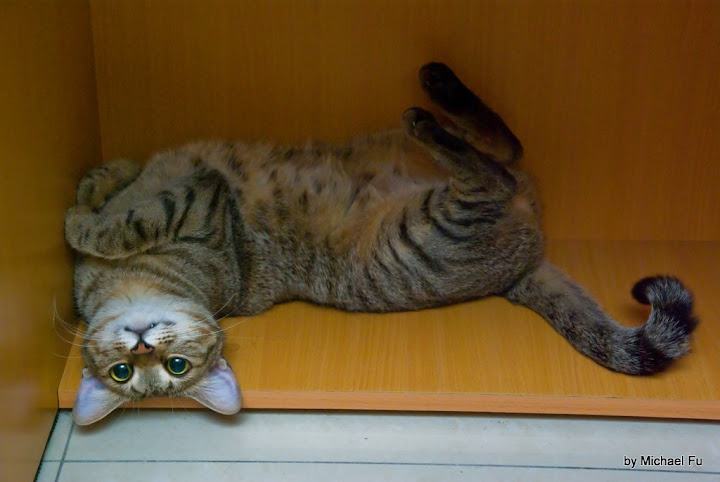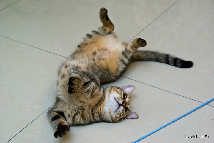 對了,小花貓也來後院張望,牠變得好胖,我都快認不出來,以為是牠的媽媽,可是牠一進門,識途老馬,一下子就跳上樓,沒錯,就是牠~~小頑皮!但是牠很現實,要到肉片,吃完就走,無情哪~~~~