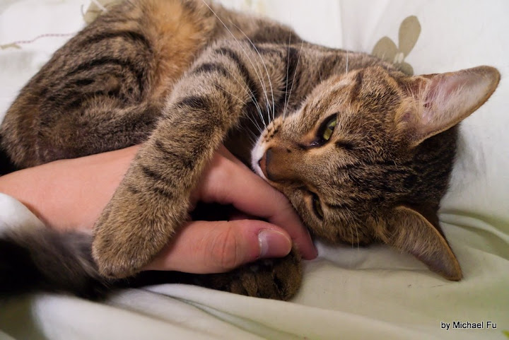 所以前幾天,我剛回家,牠也馬上來問候,磨蹭在腳旁,要吃的?!等我休息一會,牠在沙發上已舒服的睡著了,我拿出新買的梳子,替牠梳頭,可牠好像不習慣,馬上跳下沙發,直直的蹲著,我替牠梳背,哇!牠的毛好厚好亂,梳一下,掉一小把毛,牠左右轉著頭,我以為牠想梳耳下的毛,那知,冷不防的,牠一張口咬過來,兩隻前腳爪也緊抓我手腕,痛得我大叫,牠也嚇一跳,衝到門旁,我一檢查,小小的八處傷口,看來梳頭沒騷到牠的癢處,而是讓牠大大不爽,咱倆溝通不良,牠只好下警告了!