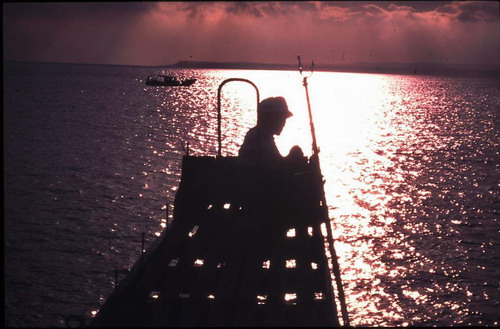 船隻失去方向,隨海流往外漂蕩。岸邊山頭越來越遠,越來越小。船上有無線話機可以呼救,但我呆坐在駕駛艙裡,手上握著話機遲遲不敢呼叫。心裡想,將如何跟海湧伯解釋遺失舵柄的經過;可能從來也不曾有過船隻遺失舵柄 … 明明是被這兩條旗魚誘惑、繳械及解除武裝,但是,如何來解釋這樣的過程。