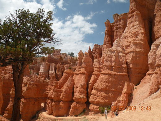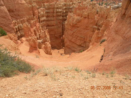 從Sunset Point下峽谷,走Navajo Loop Trail接Queens Garden Loop Trail,再從Sunrise Point上來,這是最基本的一圈,不走就白來了。起頭一路之字型步道向下,角度大約超過45度,看起來的確有點恐怖,走了發現其實還好,只要天氣不熱,流不了幾滴汗。峽谷低處景觀大大不同,襯著藍天,各個角度都令人讚嘆。在峽谷上方,看來已是壯觀無比,下巴脫臼(差點);走在峽谷底部,則是口水直滴,相機喀嚓喀嚓個不停。相片如果不好看,絕不是景不好,相信我。(更多相片在相簿裡,沒興趣的不必浪費時間去看,絕非專業水準。)