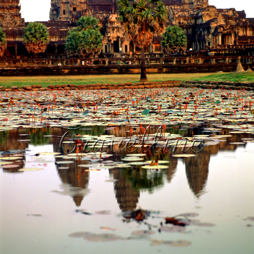選擇第二道迴廊前的蓄水塘,由於水塘上有稀疏的蓮葉,使得水面形成拼湊般的倒影,雖然天空的色彩條件不佳,但是水面所形成的亮麗色澤卻使得畫面略顯活潑,左右移動位置使得須彌山上的五座塔尖皆能入鏡,固定腳架以水中亮影加半格曝光,剪影安排在畫面垂直中央的位置,感覺上棕糖樹的剪影更讓人討喜。(吳哥窟的日出時間因季節的不同約在06:20~07:05之間)