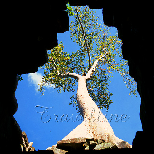 卜力坎面積廣達56公頃,在未發現前被埋藏在濃密的叢林中,與塔普隆同樣俱有巨樹和建築物共生的奇特景觀。午後3時來到此地,在北側第二道圍牆的入口塔樓下,發現了這株宛若舉臂探向穹蒼的枝幹,加上崩裂的屋頂,直覺上這就是一個框景的運用,首先考慮在框架中如何讓枝葉有向上向外擴展的效果,又不至於讓枝葉佔滿整幅框架而失去枝幹向上擎撐的力感,因此選擇了一個60度仰角的拍攝,將左右兩邊的綠葉安排接觸框架兩側讓畫面先保持平衡,而調整置中的主幹藉由粗幹到細幹再到細枝,直接讓畫面形成垂直的縱深。由於是框景又面對內外差異強烈的曝光環境,因此決定以框架內的綠葉作為曝光指數的選擇,讓塔頂邊緣呈現剪景效果,形成不規則的鋸齒狀框架,取景同時減少了框架下緣的面積,讓照射到陽光的石板形如托盤增加畫面的立體感。