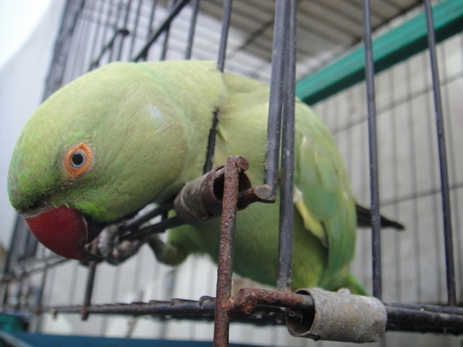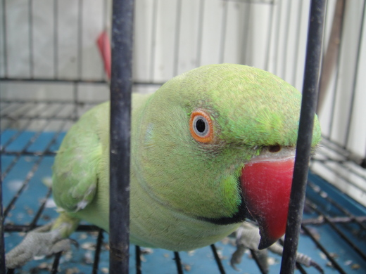 那天在路上遇到一隻鸚鵡,關在籠子裡。我和牠say hello,牠沒有反應,也許還沒學會說話,或因為不認識我而有戒心,所以第一張照片看起來有點防備的樣子。不過牠倒是好奇心很強,就在我拿照相機拍牠時,不小心跌坐地上,牠馬上探出頭來看發生什麼事,眼睛露出懷疑的眼光,卻又有點害羞樣?於是我順勢拍了2張照片,很可愛的的鸚鵡,但我不知道牠是屬於哪一類的鸚鵡。