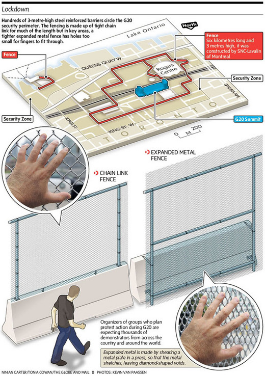 為了主辫這次G8/G20高峰會議,加拿大保守黨政府可謂大手筆,花費近十二億,其中九億三千萬是用在安全護衛上。光是戒嚴區及其週遭,便部署了六千名員警,由於多市警力不足應付,得從全國各地抽調支援。而圍繞會議中心戒嚴區的鐵網,就花了五百五十萬。